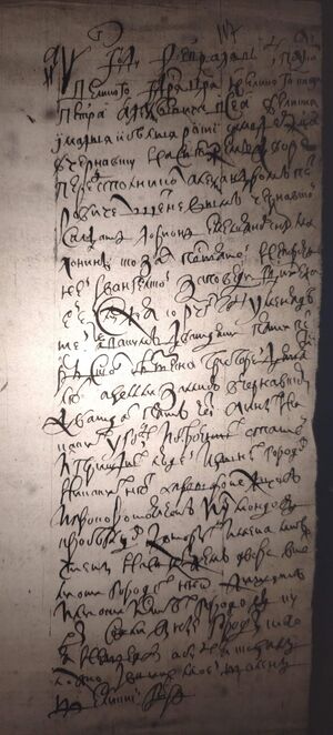 н-АѰ (1700) году февраля въ де(нь) по указу великого г(о)с(у)д(а)ря ц(а)ря и великого кн(я)зя Петра Алексеевича всеа великия и малыя и белыя Росии самодержца в Чернавску на съезжем дворе перед стол(ь)ником Александром Петровичем Шетневымъ сказал по св(я)тей непорочной евангельской заповеди г(оспо)дни еже ей ей[1] в правду города Чернавска салдатъ Иван Макеевъ сынъ Поваляев у меня отец старъ У меня ж братья Микита (в)ос(е)м- натцати лет Петръ шестнатцати летъ Службу служу со ста девяносто пятого (195/1687) году А земли за мною дватцать пять чети А иных угодий и оброчных статей и промыслов и пришлых людей из ыных городов у меня никаких нет А про воронежцов и про коротоячен и усманцов про беглецов которых имена мне чтены на съезжем дворе в техъ ли они городех н(ы)не живут или они из тех городов куды сошли в иные городы того я не ведою А будет я сказал ложно и в вины моей волен великий г(о)с(у)д(а)рь | |