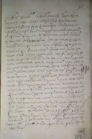 и великого кн(я)зя Петра Алексеевича всеа великия и малыя и белыя Росии самодержавца Белогородцкой про- винцыи перед г(о)с(по)д(и)ном лантратом[1] Никитою Борисовичем ворецъ рейтор Тимофей Афонас(ь)евъ с(ы)нъ Бокшеевъ сказал по евангел(ь)ской заповеди г(оспо)дни в правду живу я в поменутом селе одним двором Отроду мне петнат- цать лет У меня детей и братьевъ родственников и кресть- ян и бобылей и задворныхъ и деловых людей и ихъ детей и свой- ственников и никоких пришлых и гулящих людей и работни- ков утоенных у меня нетъ А будет я сказал ложно или хоть едину д(у)шу мужеска полу утоил и за то указал бы великий г(осу)д(а)рь учинит мне наказанья бить кну- том нещадно да сверхъ того за всякую утоенною д(у)шу ивзят(ь) из моего двора лутчего ч(е)л(о)в(е)ка в салдаты не в зачетъ положенныхъ рекрутъ