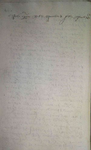 ц(а)ря и великого кн(я)зя Петра Алексеевича всеа великия и малыя и белыя Росии самодержца Белогородцкой провинцыи перед г(о)с(по)д(и)ном лантратом[1] Никитою Борисовичем Вепрейским Хотмышского уезда села Дорогоща однодворецъ салдац- кой с(ы)нъ Иванъ Алексеевич с(ы)нъ Мошкин сказал по евангел(ь)ской заповеди г(оспо)дни в правду живу я в помянутом селе одним дворомъ Отроду мне шестьдесят два года У меня с(ы)нъ Михайла полгоду племянникъ Про- хор Игнатов с(ы)нъ Мошкинъ четырехъ летъ Итого мужеска полу три ч(е)л(о)в(е)ка А окроме тех помянутых д(у)шъ мужеска полу в том моем дворе детей и брат(ь)евъ и род- ственников и крестьян и бобылей и задвор- ныхъ и деловых людей и ихъ детей и свойствен- ников и никаких пришлых и гулящих людей и работниковъ утоенных у меня нет А будет я сказал ложно или хотя единою д(у)шу мужеска полу утоил и за то указалъ бы великий г(осу)д(а)рь учинит мне наказание бить кнутом нещадно да сверхъ того за всякую утоенною д(у)шу из моего двора взять лутчего ч(е)л(о)в(е)ка в солдаты не в зачетъ положенныхъ рекрутъ