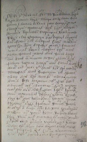 ц(а)ря и великого кн(я)зя Петра Алексеевича всеа великия и малыя и белыя Росии самодержца Белогородцкой провинцыи перед г(о)с(по)д(и)ном лантратом[1] Никитою Борисовичем Вепрейским Хотмышского уезда села Дорогоща однодворецъ городовой службы Никифор Никитинъ с(ы)нъ Демин сказал по евангел(ь)ской заповеди г(оспо)дни в правду живу я в помянутом селе одним дворомъ Отроду мне сем(ь)десят лет У меня с(ы)нъ Максим сорока трех лет У Максима с(ы)нъ Сергей полгоду Итого мужеска полу три ч(е)л(о)в(е)ка А окроме тех помянутых мужеска полу д(у)шъ в том моем дворе детей и брат(ь)евъ и родственников и крестья- н и бобылей и задворныхъ и деловых людей и ихъ детей и свойственников и никаких пришлых и гулящих людей и работниковъ утоенных у меня нет А будет я сказал ложно или хотя единою д(у)шу мужеска полу утоил и за то указалъ бы великий г(осу)д(а)рь учинит мне наказание бить кнутом нещадно да сверхъ того за всякую утоенною д(у)шу из моево двора взять лутчего ч(е)л(о)в(е)ка в солдаты не в зачетъ положенныхъ рекрутъ
